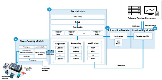 The stress sensing module (A in Figure 2), such as a smart sensor, is composed of one or several sensors, which manages the environmental variable acquisition (stressors), and one small and low cost embedded device connected to the sensors that provides communication and computation features to record, process and send the information in an efficient and reliable way. The smart sensors are autonomous, decoupled and easily configured as a distributed system. This provide a high scalability and flexibility to the system, enabling its use in anyplace and anywhere.