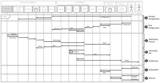 The flow done by the system components described previously is orchestrated through the coordination component by means of the stressor rules. Additionally, the setup component provides the necessary functionality to set the parameters of the modules: from the subscription process of the smart sensors to the KSI definitions and their warning ranges.