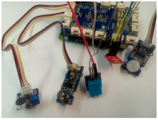 The sensing module (A in Figure 2) was developed using a small computer and five sensors. Figure 5 and Figure 6 show the components and the prototype implemented, respectively. Next, a brief description of all of them are provided: