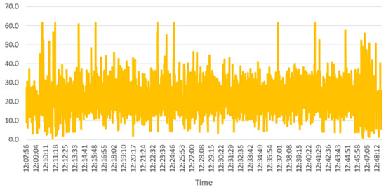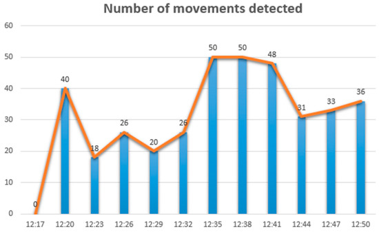 Figure 9 and Figure 10 show an example of two stressors registered by our prototype during a brief time interval in the restaurant. This information can be consulted by users from third-party applications and help them to make decisions. For example, to avoid an environment that is not recommended due to its level of stress, a user may decide not to go to the restaurant at a certain time if the user considers that the noise level or number of movements detected is too high.