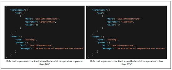 In addition, these KSIs are analyzed by the corresponding alert unit from the notification component, which will warn the user about stressful situations. Alert units are rules implemented through a set of conditions using the NodeJS json-rules-engine library. An example of two rules for the level of temperature KSI is shown in Figure 12.