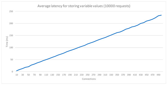 To validate the performance of the monitoring system, the latency in the variable acquisition module has been measured. The validation consisted of a set of tests where 10,000 storage requests were made, and where the concurrent access was increased from 10 to 500 in steps of 10 connections. The results (Figure 13) show that the service is stable, increasing the latency proportionally to the number of parallel connections. The response times for the requests are suitable for highly saturated environments, with numerous sensors registering values.