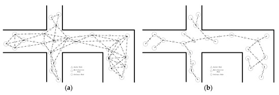 Figure 2a shows scenario 1 in a long tunnel without intersections where anchor nodes are deployed at intervals of 50 m. Figure 2b shows scenario 2 in a long tunnel without intersections where anchor nodes are deployed at intervals of 200 m to simulate that some anchor nodes were damaged in an accident. Figure 2c shows scenario 3 in an area of tunnels with a large number of intersections where anchor nodes are deployed at intervals of 50 m. Figure 2d illustrates scenario 4 in an area of tunnels with a large number of intersections where anchor nodes are deployed at intervals of 200 m to simulate that some anchor nodes were damaged in an accident. As shown in these figures, the algorithm performance is best for scenario 1 because the network comprises long tunnels without blockages and transmission occurs based on line of sight (LoS). In scenario 2, due to the presence of intersections, some transmissions cannot be directly processed, and multihops that are forwarded by certain mobile nodes must be used. This process results in higher energy consumption. Therefore, in scenarios 3 and 4, more energy consumption is required because LoS exists and fewer anchor nodes are available. In general, these conditions will increase energy consumption in GCUMs.