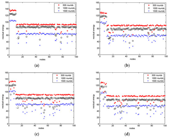 (a) Residual energy in different rounds in scenario 1. (b) Residual energy in different rounds in scenario 2. (c) Residual energy in different rounds in scenario 3. (d) Residual energy in different rounds in scenario 4.