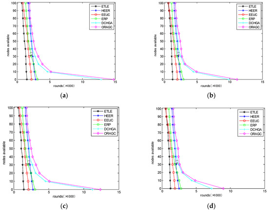 The comparison of lifetimes is shown in Figure 3. Notably, the ORAGC algorithm saves the most energy in the four different scenarios (as previously described). This result occurs because some routing algorithms, such as the ETLE and ERP methods, cannot address heterogeneous factors, and only one factor is considered in these algorithms. For example, the heterogeneity of the initial energy is the only factor considered in the ETLE. Therefore, if the network connectivity is poor, the collision rate will be high and result in a high probability that retransmission will cause extra energy consumption, and vice versa. The DCHGA considers different heterogeneous factors in the clustering process, but the energy consumption model is not optimized for the heterogeneity of the network. Therefore, the ORAGC improves this approach, and a weight model is established that considers connectivity, energy consumption, and delays based on the DCMST.