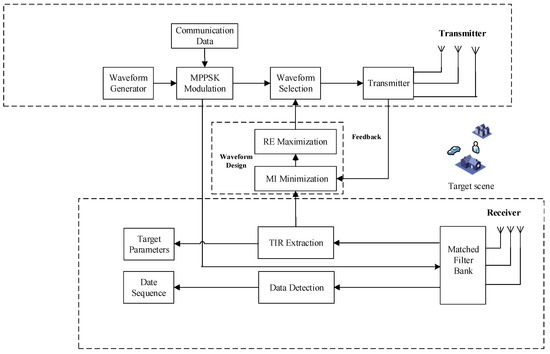 The paper is organized as follows: in Section 2, an adaptive MIMO radar-communication system architecture is described. In Section 3, we present a MIMO radar signal model and MPPSK information embedding scheme. In Section 4, we formulate a novel waveform optimization algorithm. The transmitted waveforms are designed based on RE and selected based on the MI criterion. The simulation results illustrating the proposed methods are provided in Section 5, and concluding conclusions are drawn in Section 6.