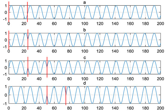 (a) 4-PPSK modulated waveform for symbol “0”; (b) 4-PPSK modulated waveform for symbol “1”; (c) 4-PPSK modulated waveform for symbol “2”; (d) 4-PPSK modulated waveform for symbol “3”.