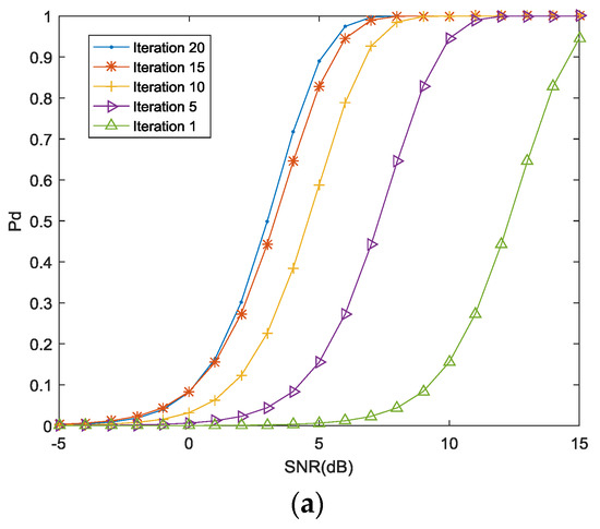 Figure 4a indicates the detection probability achieved by the proposed approach for false alarm probability . For a stationary radar scene, 1000 simulations have been run for each at a particular value of the received SNR. The next transmission waveform is selected according to the proposed two-step optimization algorithm, and the optimization process is repeated for 20 iterations. As seen from Figure 4a, the required SNR value decreases as the number of iterations increase for a fixed detection probability. The proposed algorithm converges after 15 iterations, yielding a detection probability of 0.9 at SNR = 4 dB as compared to SNR = 14 dB at the first iteration. However, the detection probability does not show further improvement after 20 iterations.