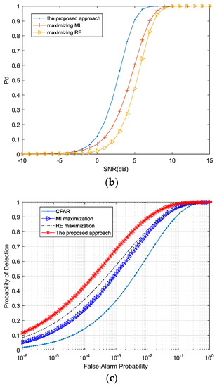 Finally, Figure 4c shows the ROC for four different configurations. (1) constant false alarm rate (CFAR) detection based on Neyman-Pearson criterion using the phased antenna arrays; (2) MIMO radar employing the maximization of MI as presented in [39]; (3) MIMO radar employing the maximization of the RE as presented in [39]; (4) MIMO radar-communication transceiver employing the proposed waveform optimization scheme.