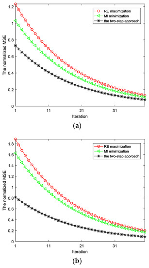 Figure 5a indicates the normalized MSE with regard to the estimation of TIR under the constraint of transmitted power in multipath environments. This plot demonstrates an improved MSE performance for the proposed optimization approach as compared with the maximization of RE and minimization of MI modules. As seen from Figure 5a, the normalized MSE of TIR based on the proposed algorithm is smaller than that using the maximization of RE. Similarly, the normalized MSE of TIR based on the proposed algorithm is smaller than that using the minimization of MI, particularly for the first few iteration.