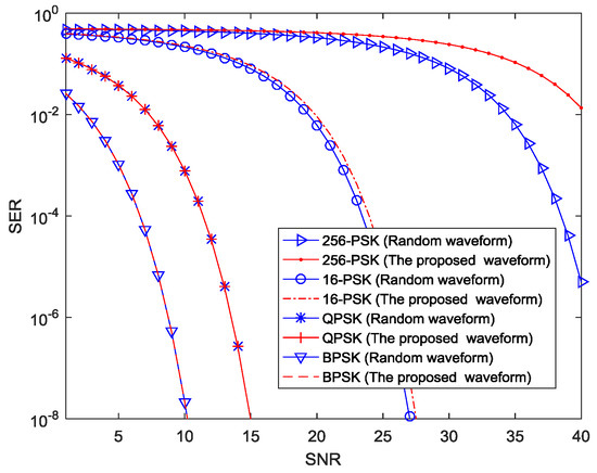 Figure 6 also shows that for BPSK, QPSK, and 16-PSK constellations, the SER performance of optimized waveforms is nearly the same as that of the random waveforms. However, for the 256-PSK constellation, the SER performance of the proposed waveforms is worse than random waveforms. As constellation size is increased, the cross-correlation levels become higher. Therefore, we choose reasonable constellation size results in a tradeoff between SER and data rate requirements from a communications perspective.