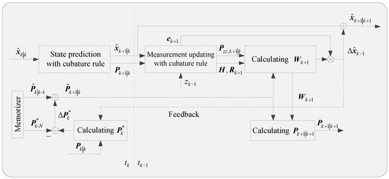 The functions, Equations (47–49), constitute a major part of the covariance adaption framework. As shown in Figure 1, the state prediction and measurement updating are completed within CD-CKF, the difference is the covariance prediction process. The post-covariance information in the memorizer is used to update the covariance online, and it is also used to update the cubature gain . Then the is calculated to generate the state estimation , and can be used for covariance generation from feedback channel.
