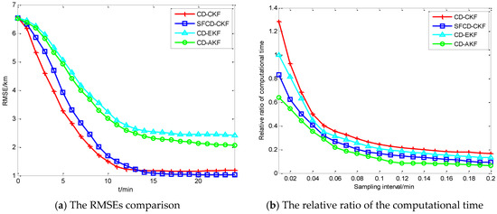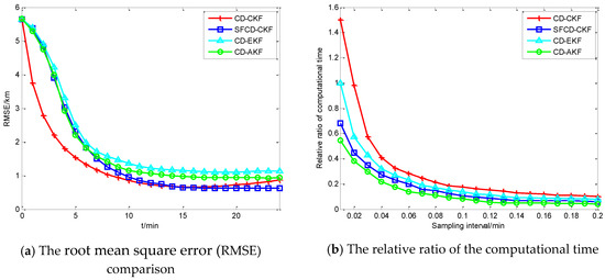 Figure 2b shows the relative ratio of the computational time, and the CD-EKF with sampling interval 0.01 is the datum point. In general, the computational time will decrease with the increase of sampling interval. Because of the complex matrix operation, CD-CKF is the most time-consuming method computationally. CD-AKF and SFCD-CKF exhibit better computational efficiency comparatively, which shows that the framework of covariance online updating has an advantage in improving the computational efficiency.
