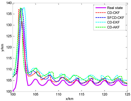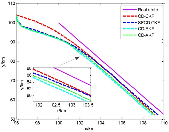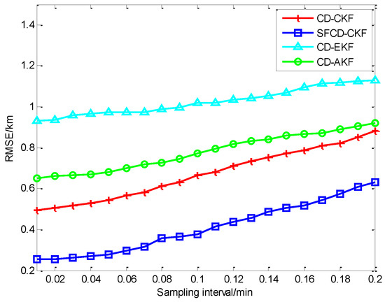 As is shown in Figure 2a, the RMSE of CD-CKF decreases faster than the other three methods in the first 10 min. Because of the superior performance of CD-CKF in the nonlinear problem (actually, it is a nonlinear measurement problem in this CV BOT model), CD-CKF is more accurate for filtering in the whole BOT process. The performance of SFCD-CKF is not as good as CD-CKF at the initial moment, while RMSE of SFCD-CKF remains in decline to the end of the process, and the accuracy is higher than the other methods. CD-AKF is a CD-EKF method modified by the idea of covariance online updating, and its accuracy is higher than CD-EKF; however, when compared with CD-CKF and SFCD-CKF, the framework of EKF used in CD filtering is suboptimal, and the accuracy of CD-AKF and CD-EKF are lower comparatively. Figure 3 shows the RMSE with different sampling intervals. In general, the accuracy can be improved with smaller sampling interval, while the computational efficiency would decrease. Figure 4 shows the state estimate with these different filtering methods, where the real state is the track (or path) of the target, and the path length is 48.53 km.