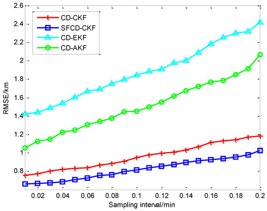 Figure 5a shows the different RMSEs of four methods when dealing with a nonlinear filtering problem. CD-CKF and SFCD-CKF show the advantage for nonlinear filtering. In the last stage of the target tracking process, the accuracy of SFCD-CKF is slightly higher than CD-CKF. As we can see from Figure 2a and Figure 5a, the performance of SFCD-CKF is superior over CD-CKF only when the error approaches zero. This indicates that the online covariance updating has an advantage in state estimation with micro variation of the covariance because the approach is sensitive to unpredictable errors in this moment than in the moments when the covariance changes rapidly. The computational efficiency of SFCD-CKF and CD-AKF are demonstrated to be better than the other two methods in Figure 5b. Figure 6 shows the RMSE with different sampling intervals. The accuracy of CD-EKF and CD-AKF are improved rapidly along with the decrease of the sampling intervals, because the error of EKF framework used by CD-EKF and CD-AKF is large when dealing with the nonlinear filtering problem, and the impact of sampling interval on estimation accuracy is significant. Figure 7 shows the state estimate with these different filtering methods, where the real state is the track (or path) of the target. The path length is 133.01 km. With superior computational efficiency, SFCD-CKF generally has an advantage in solving unpredictable error problems.