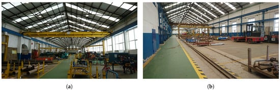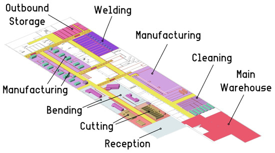 The Joint Research Unit deals with different parallel lines that work on heterogeneous topics like robotics, factory automation, process analysis or the application of new wireless communication systems on a ship. One of such research lines is called “Pipe Auto-ID” and, as its name implies, it deals with the problem of identifying pipes automatically through their life-cycle. Note that pipes are essential in shipbuilding: a ship usually contains between 15,000 and 40,000 pipes that differ greatly in their typology (i.e., size, material, shape, accessories), although they all are built at the same workshop in a shipyard that Navantia owns in Ferrol (Spain). The workshop is divided into two wings (shown in Figure 1), where pipes go through the different stages described later in Section 2.1.