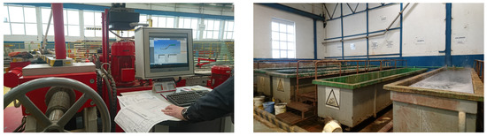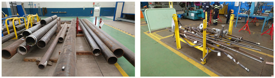 The second stage for most pipes is bending (obviously, straight pipes do not need it). The procedure is performed with computerized bending machines (one of them is shown in Figure 4 on the left). Next, if a pipe requires to be cleaned chemically, it has to be moved to the degreasing and rinsing area, where acid and caustic solutions are applied in tubs (in Figure 4, on the right). After cleaning, pipes can go to one of the two manufacturing stages in order to add accessories (e.g., hydraulic valves, connection fittings), either by welding them or by using other techniques. Finally, the manufactured pipes are packed into pallets that are placed in the outbound storage area until they are required to be mounted in a ship.