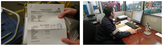 It is worth noting that all the previously mentioned processes were traditionally carried out manually by Navantia’s operators. As it is shown in Figure 5, many processes made use of paper forms that, after being filled by the operators, had to be uploaded to the system by a supervisor, which clearly decreased the productivity of the workshop. Thanks to the CPS proposed in this paper, the vast majority of the information can be stored and modified through digital devices, removing most of the bottlenecks and errors related to manual fillings and uploads.