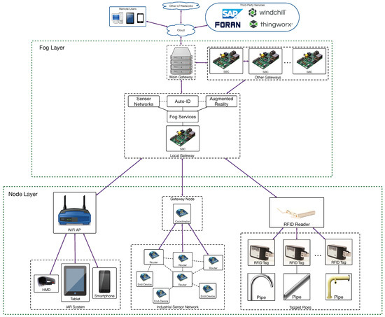 The proposed system architecture is shown in Figure 6. As it can be observed, it is a three-layer fog computing architecture. The layer at the bottom is the node layer and includes all the devices (i.e., RFID devices, sensor networks and Industrial Augmented Reality (IAR) interfaces) that make use of the services provided by the fog layer. The fog layer is composed by Single-Board Computers (SBCs) that are scattered throughout the shipyard and that act as gateways. The SBCs provide fog services, including low-latency and data processing services like the RFID positioning service, sensor fusion, or data caching for streaming content to IAR devices [34,35]. Since this paper is focused on traceability, it will only detail the inner workings of the fog positioning service.
