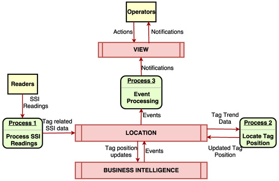 Figure 7 shows how the different sources of data from the node layer (i.e., readers and operators) interact with the indoor positioning fog service. Readers provide data to the fog service back-end in order to process them for the location and tracking algorithms. In the case of operators, they interact with the display module, providing certain data related to their tasks, mainly details of the pipes to be processed.