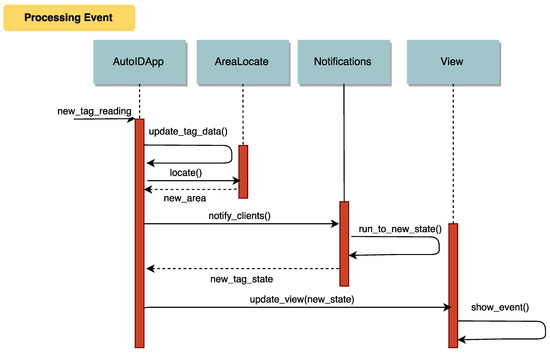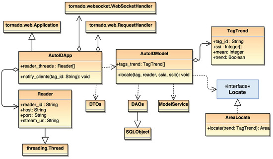 Figure 8 shows a simplified class diagram of the developed location subsystem, where it can be observed that Tornado [40] was used as the web server. With respect to the location algorithm, it is first important to note that pipes cannot be located anywhere in the workshop: there are specific areas where the different pipe processes are performed. This leads to the creation of logic areas, which are related to relevant physical areas of the workshop (e.g., storage areas, pipe processing machines, work benches). Every logic area is associated with an RFID reader and, thus, one or more readers cover a physical area.