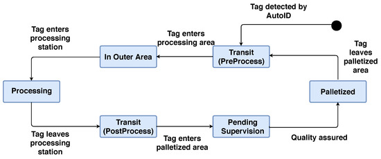 A pipe begins its life-cycle in the workshop when it is first detected by the RFID system. In that moment the pipe is considered to be in transit. Note that every pipe has to stop at every production area of the workshop, but the pipe can be processed or not in such an area. If there is no need to process the pipe (e.g., not all the pipes need to be bent), it is palletized (i.e., it is placed on a pallet). In the case that it needs further processing, then it first would have to be moved to the processing area, cross the outer area, be processed, and then leave the processing station towards a pallet where a quality control would be performed.