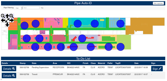 The display module (in Figure 11) has been developed as a web application with the objective of being able to use it not only in specific software platforms, but in any system with a web browser installed (e.g., tablets, smartphones, desktop PCs, Macs). It consists of a map of the workshop where pipes are displayed together with a task list that indicates the pending work to the operators. Both components are updated in real time by the fog service. In the case of the task list, its updating depends on the area where the operator is located, since every operator also wears an active RFID tag (in a pocket or hanging from his/her belt).