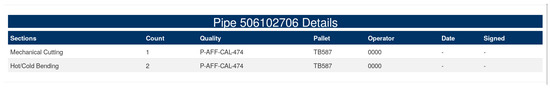 Note that the details shown about a pipe in an area depend on the role of the operator using the application. For example, only supervisors can make use of the sign button to approve a pipe quality control (in Figure 12, on the right).
