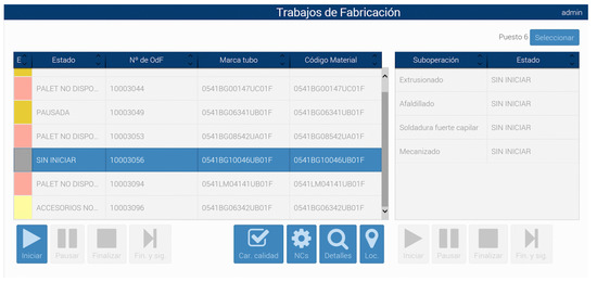 The MES back-end was developed on top of Siemens’ Simatic IT [41]. The front-end consists in a web application designed to be accessed through tablets when wearing gloves. As an example, in Figure 15 such a front-end shows the task pool of one of the operators at the manufacturing stage. On the left, the system indicates for every task its state (Estado), the FO number (N° de OdF), the pipe ID (Marca tubo) and the pipe material ID (Código Material). On the right of the screen, the details on the different sub-operations to be carried out on the selected task are shown. At the bottom, diverse icons allow operators to begin, pause and stop the selected task/sub-operation. Other icons are related to show the quality characteristics of the task (Car. Calidad), to transmit to the engineering team the detected errors (NC, No Conformidades) or to show the position of the materials used in the task/sub-operation (by clicking on the Loc icon).