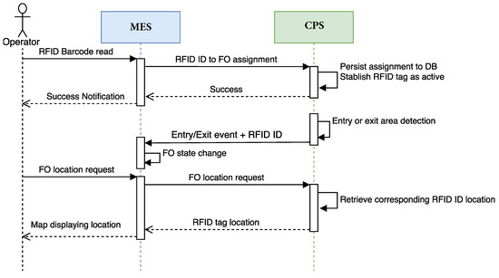 - Tag assignment to pipes. An RFID tag can be assigned to a pipe or to a pipe accessory by using the MES. For such a purpose, first, an operator starts a cutting operation related to a FO in the MES. After the pipe is cut and ready to be palletized, an RFID tag is attached to the pipe. Then, the operator reads the tag ID with a reader, which is sent to the MES. Next, the MES notifies the event to the CPS, which stores the relationship pipe-RFID tag in its internal database and starts tracking the pipe.