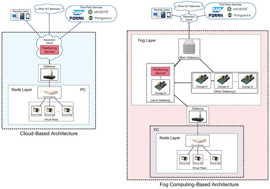 - It is also fair to indicate that, during the experiments, every fog gateway only executed the positioning service, while, as it is illustrated in Figure 6, the fog-computing architecture was designed to provide multiple services on the same fog gateway. Therefore, it can be concluded that, although fog-computing services seem to be best option for providing low response latencies, their results may be influenced by the computational and network load associated with other services running simultaneously on the same fog gateway. However, note that, in a fog gateway, the number of concurrent service requests is actually low in comparison to the ones received by a cloud, since it only provides services to a reduced area (e.g., part of a workshop), while the cloud serves the whole company.