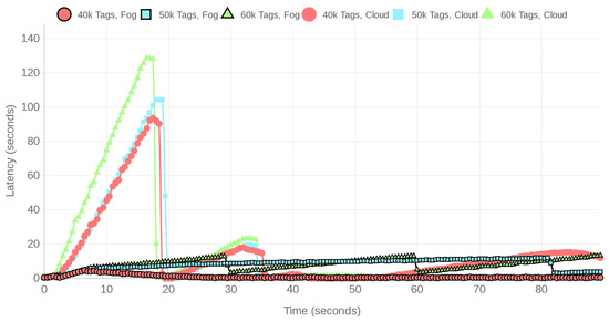 - In the shipyard, it is not usual to manage more than 1000 tags with only one computational device, but it is interesting to evaluate such a scenario to determine the performance of the implemented architectures. Thus, it can be observed that a single inexpensive fog gateway that runs the implemented positioning service can respond faster and with a higher sample processing success rate than a cloud-based system for up to 40,000 simultaneous tags. For 50,000 or more tags, the fog gateway gets saturated and the cloud system becomes a faster alternative, although its sample processing rate is lower than for the fog gateway.