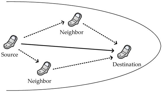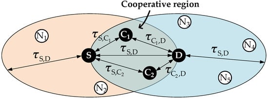 Traditionally, ARQ methods are divided into three categories: stop-and-wait (S&W), go-back-n (GBN), and selective repeat (SR) []. In the S&W method, a transmitter waits for an acknowledgement (ACK) from a receiver after transmitting a data packet and then retransmits the data packet if it fails to receive the ACK. Many existing MAC protocols for the UWSNs [,,] employ the S&W method due to its simplicity and suitability for half-duplex channels. However, long propagation delays in the acoustic signals make the S&W method inefficient because the sender’s lengthy waiting time wastes resources. In the GBN and SR methods, on the other hand, senders can transmit data packets continuously while waiting for receivers’ ACKs. This can increase network throughput at the expense of receiver processing complexity, but it requires the full-duplex system for concurrent delivery of ACK packets, which has yet to prove workable in the bandwidth-limited underwater channel. Another new approach is the so-called cooperative ARQ, which is based on the cooperative communication technique. The basic idea of the cooperative communication technique is that neighbor nodes (cooperators) can provide an alternative path for other pairs of communicating nodes (source–destination), as shown in Figure 1. This generates spatial diversity by enabling the transmission of independent copies of the signal, thus allowing independently faded versions of the signal at the destination [].