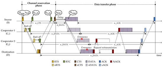 Figure 2 illustrates a basic UCMAC procedure with two cooperators ( and ) that are located between the source (S) and destination (D). UCMAC consists of two phases, channel reservation and data transfer. In the channel reservation phase, the source reserves the channel and identifies the cooperators through their control packet responses. In the data transfer phase, the source transmits a data packet (DATA) attaching a list of cooperators sequenced by closeness to the destination. Then, referring to the list, the destination requests retransmission of erroneous packets to cooperators in the closest-one-first manner. Meanwhile, the cooperators store the data packet (denoted by xDATA in Figure 2) that is overheard during the source’s transmission. The parameters carried by packets are denoted inside speech bubbles as shown in Figure 2 and the details along with time parameters like w_ACK and w_DATA are explained in the corresponding subsections. Table 1 defines some of the parameters in advance to make it easier to understand subsequent sections.