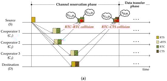 RTC and CTS, the responses to the RTS from cooperators and the destination, respectively, may collide at the source. Figure 4a shows examples of RTC–RTC and RTC–CTS collisions. RTC–CTS collisions are significantly more severe than RTC–RTC collisions; they trigger the whole procedure to restart from the beginning. To avoid RTC–CTS collisions, we prohibit the neighbors that may cause collisions from transmitting RTC. Based on the pre-acquired knowledge regarding propagation delay information, the source builds a list of potential RTC–CTS collision-causing neighbors, , and includes it into RTS. Then the neighbors included in are banned from sending RTC. In Figure 4b, represents a case of RTC transmission prohibition so that CTS can escape a collision at the source. Meanwhile, RTC–RTC collisions can be alleviated by implementing random backoff times.
