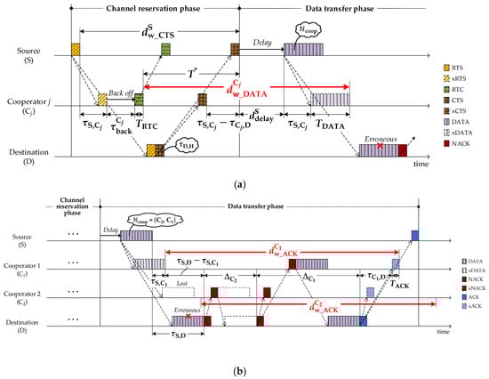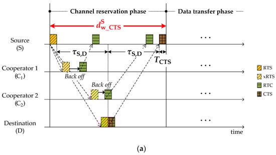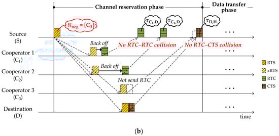 As shown in Figure 7a, the cooperator j takes a random backoff () before transmitting RTC, which is intended to prevent RTC–RTC collisions. The cooperator j then stays silent to avoid causing any collision with the source–destination communication. In order to estimate the silence duration, the cooperator j needs to know how many cooperators could be engaged in the communication by reading the carried in DATA, so, the cooperator j waits to overhear the DATA during the period of: