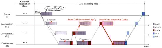 In Figure 5, the source sends the deferred DATA to the destination, which contains . The next section explains the reason for deferment. Overhearing the DATA, the neighbors included in recognize themselves as cooperators and hold the successfully decoded data payload in case a request for retransmission is sent. Those not included in are exempted from the cooperation. The possible reasons for not being included in are: