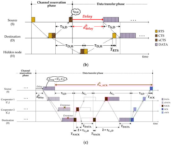 which is easily obtained from Figure 6a. After receiving CTS, the source intentionally delays DATA transmission to avoid a collision with RTS sent by a hidden node (H) who starts a new communication with the destination as shown in Figure 6b. The amount of delay required is denoted by . To avoid the RTS–DATA collision, the DATA should be scheduled to arrive after the possible RTS arrival (Figure 6b). That is: