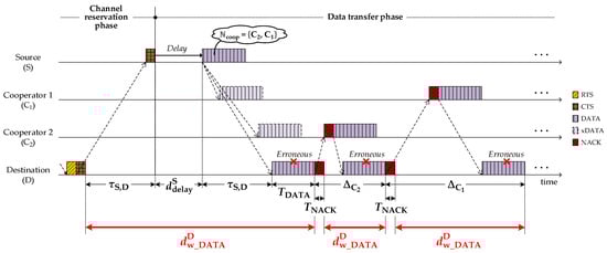After DATA transmission, the source waits for ACK from the destination. The waiting time for ACK might be augmented according to the number of cooperators participating in the retransmission. The time segment augmented by cooperators j is given by (Figure 6c):