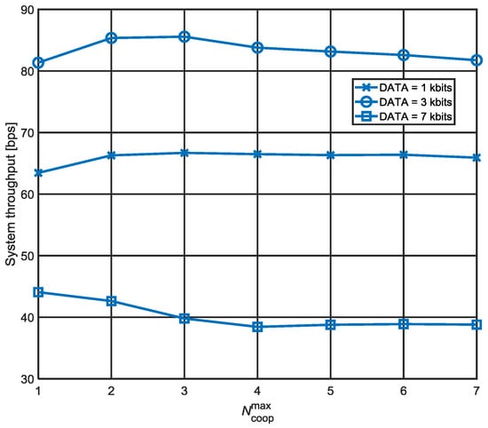 Figure 9 demonstrates the existence of an appropriate in terms of the system throughput for various DATA sizes. It is generally accepted to assume that high cooperative diversity gains lead to a high system throughput. If is small, the cooperative diversity gains may not be maximally obtained even though only a small amount of overheads is produced by additional cooperation process at the same time. On the other hand, a high makes excessive overheads exceed the cooperative diversity gains. Consequently, an appropriate level of exists depending on network circumstances. For example, when the DATA size is 3 kbits, we expect that of 3 results in the highest system throughput.