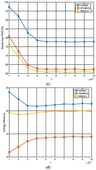 In Figure 10, we compare UCMAC with MACA-U and CD-MACA by setting and DATA size at 2 and 1 kbits, respectively. Overall, UCMAC outperforms the other schemes as a result of its well-coordinated cooperation process. MACA-U, which is non-cooperative, shows relatively low performances compared to cooperative protocols. First, our analysis shows that UCMAC offers much better system throughput than other schemes (Figure 10a). This is because retransmitted DATAs arrive at the destinations more quickly with the aid of the well-coordinated cooperators. Although CD-MACA also benefits from cooperation, such cooperative gains are smaller than those of UCMAC mainly due to the lack of coordination between the cooperators. CD-MACA performs slightly better than MACA-U, allowing neighboring nodes or cooperators to retransmit DATA opportunistically. In MACA-U’s case, when packet errors happen, the destinations do not request any cooperation and just rely on source retransmissions. If packet errors persist, each source is more likely to take a longer backoff time, which will result in larger decreases in the system throughput. The result of latency can be understood in the same context (Figure 10b). In CD-MACA, packet collisions may occur between DATAs retransmitted by the cooperators; UCMAC escapes such collisions by making the cooperators retransmit DATA one at a time. This increases the likelihood that the intended destinations successfully receive DATAs after a smaller number of retransmission, thus reducing the latency. At the same time, elimination of packet collisions also helps UCMAC to achieve the high single-hop PDR (Figure 10c). This means that cooperation is highly effective in the delivery of DATAs even when the traffic is heavy, and UCMAC can be reliable under any circumstances. In CD-MACA, more DATAs end up being discarded due to collisions, which results in the lower single-hop PDR in spite of cooperation. Obviously, non-cooperative MACA-U has the lowest single-hop PDR as the destinations rely solely on their own sources. In terms of energy consumption, our analysis also shows that UCMAC is most efficient (Figure 10d).