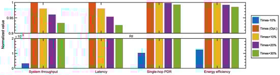 Figure 11 verifies that the waiting times provided in the manuscript guarantee the highest network performances in UCMAC. In the figure, each result of the performance metrics is normalized to result of the waiting times (orange-colored bar) obtained through the Equations (2)–(10) that could potentially yield the best network performances. Adding extra time of 10–30% to the calculated waiting times degrades the performances of the network only by a small margin. That is largely due to the waste of the channel resources. On the other hand, with a 10% reduction of the waiting times (blue-colored bar), the network’s performance is significantly degraded. That means the values we got from the equations provide sufficient, but not excessive time for the desired packets to arrive. As a result, the maximum cooperative diversity gains require a careful decision of the waiting times, which compensates for the effects of the space–time uncertainty problem.