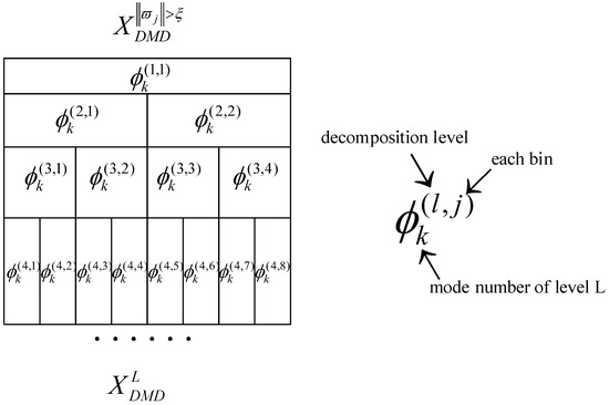Step 2. A hierarchical DMD is introduced to split the reconstructed signal with several levels, inspired by the idea of wavelet packet decomposition. Mathematically, we divide the solution of the DMD approximate solution of Equation (18) into slow modes and fast modes, by splitting the number of at its median: