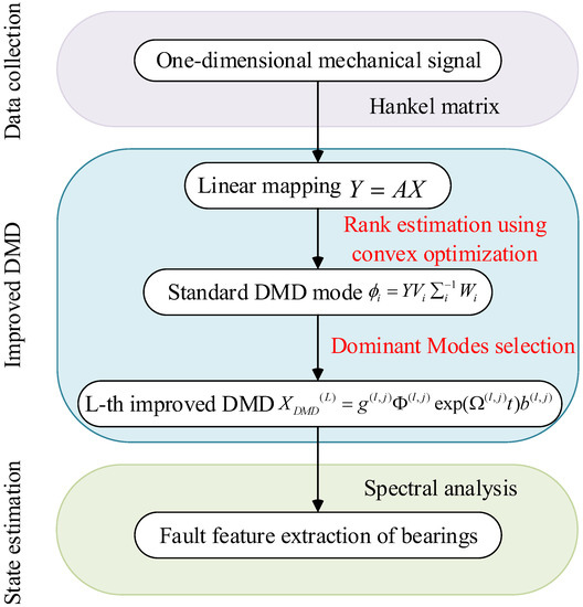 Dynamic mode decomposition (DMD), stemming from the fluid mechanics community [10], has been characterized as a powerful tool for Koopman spectrum analysis technology based on equation-free and data driven methods. It can extract the spatiotemporal coherent characteristics by decomposing the complex flow field into a series of simple expressions based on its inherent space-time. Recently, DMD is successfully used for prediction, state estimation and complex system control in the field of fluid mechanics [11]. Schmid [12] firstly defined the DMD algorithm by demonstrating that the theory was capable of describing the internal mechanism based on the numerical simulation and measured experimental data in a high-dimensional flow field. The core of the DMD algorithm can be regarded as a space dimension reduction technique, similar to the algorithm of proper orthogonal decomposition (POD). While POD decomposes data into a series of multiple orthogonal modal frequency components, and ranks them in terms of energy content, the DMD algorithm can describe the dynamic characteristics in a series of single non-orthogonal frequency modes and superpose them with coefficients according to the time scale [13]. Rowley [14] pointed out that DMD was closely related to the Koopman operator theory, a linear but infinite-dimensional operator that represented the action of a nonlinear dynamic system. Thus, DMD is applicable to deal with nonlinear systems such as roller bearing signal (which we attempt in this paper) based on the consideration that DMD is a numerical approximation to Koopman spectral analysis. The standard DMD algorithm for mechanical time-series signal processing is outlined in Section 2 with the theory provided by literature [12]. Since the appearance of the DMD algorithm, widespread use and great achievements have been made in the field of fluid application [11,13,14,15,16,17,18,19,20]. Nowadays, research regarding DMD mainly focuses on two aspects. Firstly, noise suppression algorithms were presented to correct the decomposition results due to the influence of noise. DMD cannot accurately extract dynamic characteristic information when the snapshots, periods of small data, are immersed by noise. These strategies range from a noise-corrected dynamic mode decomposition with control (ncDMD) [15], forward-backward DMD (fbDMD) [16], total least squares DMD (tlsDMD) [17], compressed DMD (cDMD) [18], and sparsity-promoting DMD (spDMD) [19]. Though most of the varietal DMD algorithms can extract fluid dynamic information more accurately, they are not self-adaptive as they need to give a rank truncation order in their processes. Secondly, it aims at computational complexity reduction in pre-processing and/or post-processing when big data are processed. This problem does not apply to the mechanical signals, since the amount of mechanical signals is usually smaller relative to the fluid domain.