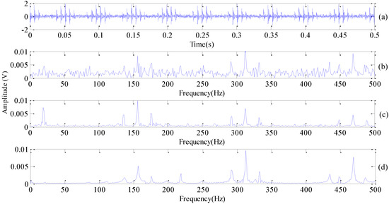 Most frequently, the fault of rolling bearing appears as the damage in outer race, inner race, and/or the surface of rolling elements. Generally, three common types of faults on outer race, inner race and rolling elements can be modeled as , , respectively. Here, and are denoted as rotational frequency and cage frequency. The time-domain fault simulation signal of the inner race is plotted in Figure 3a, added by the Gaussian white noise so the SNR ratio is 6. The parameters selection of Equation (24) is listed in Table 1.