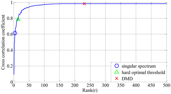 Cross correlation coefficient between DMD reconstruction signal and original simulation signal with different truncation rank r. Cross correlation coefficient is first ascending and then slightly declining. The rank () in blue circle point obtained by singular spectrum; the rank () with the green triangle point obtained by the hard optimal threshold; the rank () with a red cross mark obtained by our method.