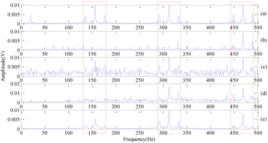 Comparisons between improved DMD with other conventional spectral analysis methods are characterized in Figure 5. Figure 5a is the frequency spectrum of the original situation signal without noise taking by FFT. Figure 5b is the result of SVD, and we select the first four singular values for signal reconstruction. Figure 5c is the multi-scale WT signal spectrum; here, we use wavelet function db4 with three scale wavelet decomposition [5], and choose the high frequency component of the second layer for signal reconstruction. Figure 5d is the frequency spectrum by applying FFT on superposed IMFs of EMD, and we choose IMFs of 1, 4, 5, 6 for superposition. Figure 5e was obtained by our improved DMD method, while , . SNR of the reconstruction signal is calculated as 7.8, 9.5, 6.6, 14.2 from Figure 5b–e successively. Our method has a tremendous advantage in both denoising and fault feature extraction.