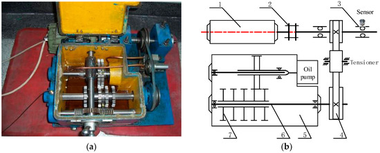 Gear-bearing comprehensive failure device: (a) test rig general view; (b) structure diagram of test device: 1—motor, 2—coupling, 3—test rolling bearing from 6207 series, 4—belt pulley, 5—housing, 6—transmission shaft, 7—gear.