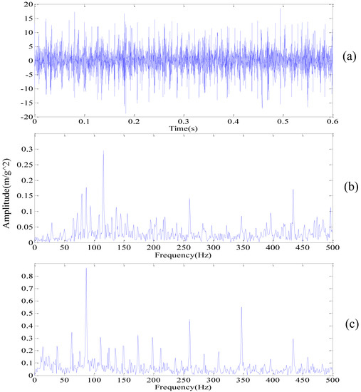 The measured signal in the time domain and frequency spectrum: (a) time domain; (b) FFT spectrum; (c) envelope spectrum.