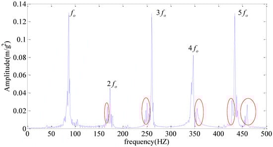 Obviously, we can’t judge whether there is a bearing fault from Figure 7b for a large amount of interference frequencies presented in the frequency spectrum. Figure 7c is slightly better than Figure 7b, but there are still some noise frequencies presented in the frequency spectrum. Meanwhile, in order to illustrate the effectiveness of our method, the frequency spectrum of WPT is applied and the results are shown in Figure 8. Here, we use wavelet function db15 with eleven layers of decomposition. Though it is obvious that the fault frequency and its harmonics (, , , ) can be identified in Figure 8, where is the frequency of the outer race, the noise is still present in the acquired signal, as we can see in the red elliptical mark.